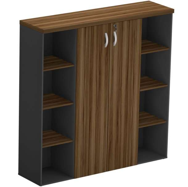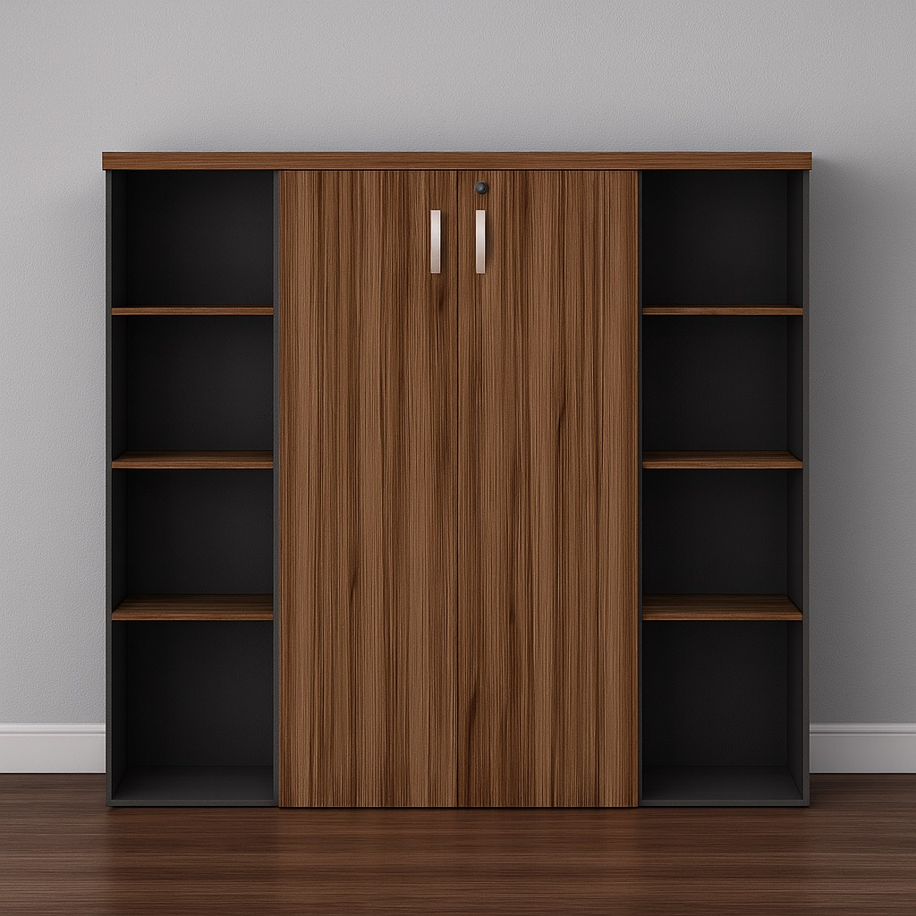 Nas laterais, o móvel conta com nichos abertos com prateleiras ajustáveis, perfeitos para expor materiais de uso diário ou itens decorativos. Seu tampo superior resistente também pode ser usado como apoio para impressoras, pastas, quadros ou adornos corporativos.