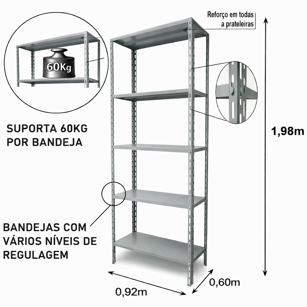 Em primeiro lugar a estante vem com 05 bandejas reguláveis . Corpo com chapa de aço 18 e bandejas com chapa de aço 22 com reforço e capacidade de 60 kg por bandejas (bem distribuídos ) Cor da estante é cinza .