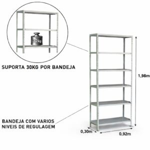 Prática e versátil, ideal para organização e exposição dos mais diversos itens, seja para escritórios, papelarias, escolas, estoques ou ambientes residenciais. Possui 6 bandejas reguláveis e muito resistentes, com capacidade de peso variável de acordo com a chapa. Produto de fácil montagem, com a simples colocação de porcas e parafusos unindo as bandejas às colunas.