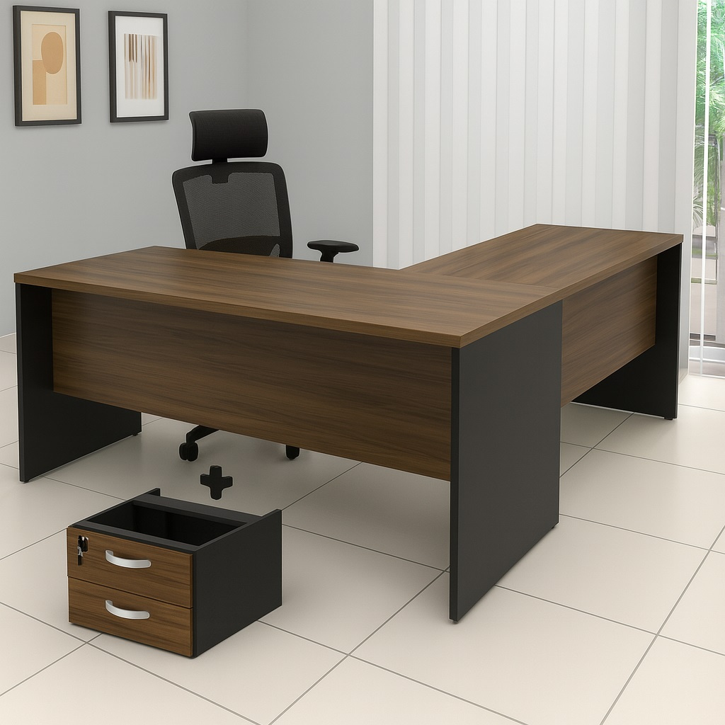 Em primeiro lugar a mesa vem sem gavetas . Além disso possui regulagem de altura dos pés. Cor da mesa é Nogal/ Preto . O seu fabricante é Maranello.
