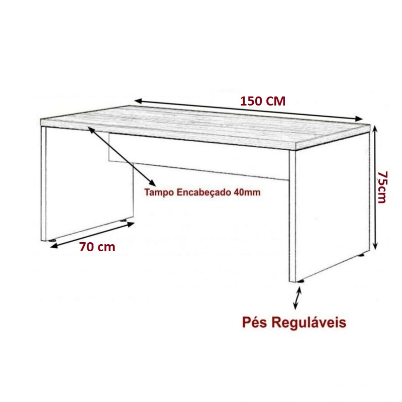 A mesa tem medida de 150 cm largura , profundidade de 70 cm e altura de 75 cm . A espessura do tampo é de 40 mm encabeça . Espessura do pé é 25 mm.