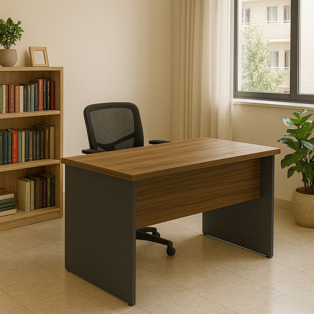 Em primeiro lugar a mesa vem sem gavetas . Além disso possui regulagem de altura dos pés. Cor da mesa é Nogal/ Preto . O seu fabricante é Maranello.