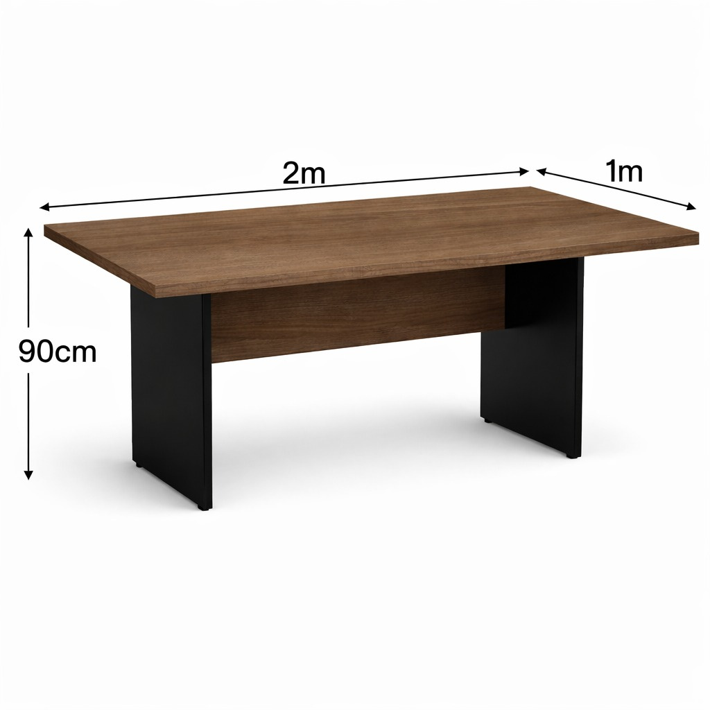A mesa de reunião tem medida de 200 cm , profundidade de 100 cm e altura de 90 cm. A espessura do tampo é de 40 mm encabeça com borda em ABS de 1 mm . Pé painel em MDPBP com borda em PVC 0,45mm com espessura de 25 mm .